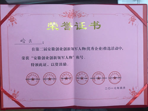 熱烈祝賀我公司總經(jīng)理哈云榮獲“安徽創(chuàng)業(yè)創(chuàng)新領(lǐng)軍人物”稱號(hào)